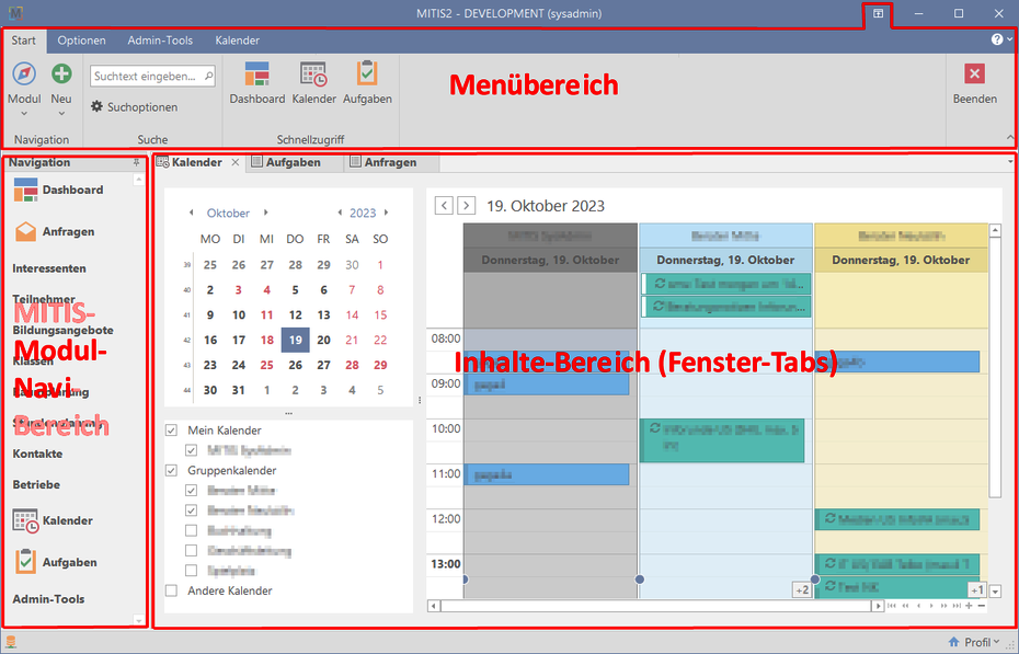 Die Programm-Oberfläche von MITIS ist grob in 3 Bereiche aufgeteilt…
