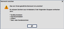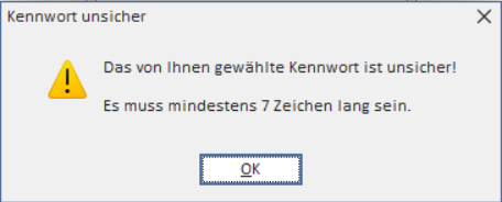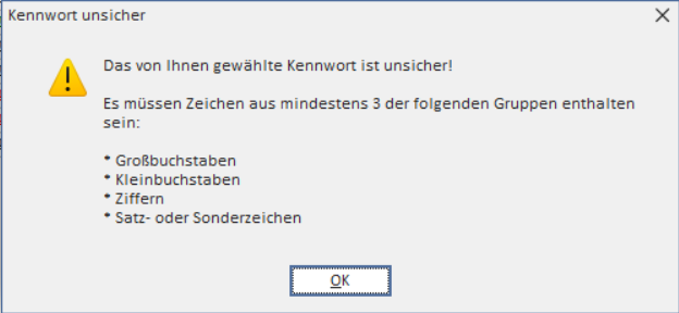 Achten Sie auf die Sicherheitsstandards für Passwörter. Sofern keine betriebsinternen Regelungen festgelegt sind, gelten die voreingestellten Mindestanforderungen (s. Abb.)