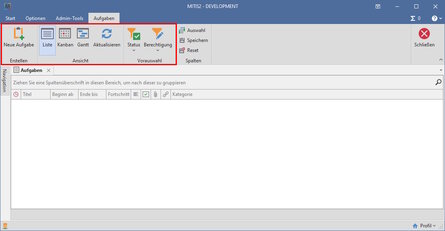 2. Wie genau Ihr geöffnetes Aufgabenmodul aussieht, hängt davon ab, welche Benutzerrechte Ihnen zugewiesen wurden. Die Abbildung zeigt beispielhaft eine voreingestellte Standardansicht beim ersten Verwenden des Features.