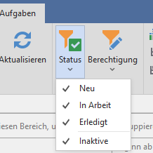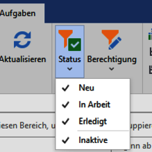 Klicken Sie auf Aufgaben > Status und wählen Sie aus, welche Aufgaben in der Übersicht angezeigt werden sollen. Aktivieren oder entfernen Sie hierfür das jeweilige Häkchen per Klick. Sind alle 4 Häkchen gesetzt, sehen Sie alle Aufgaben.