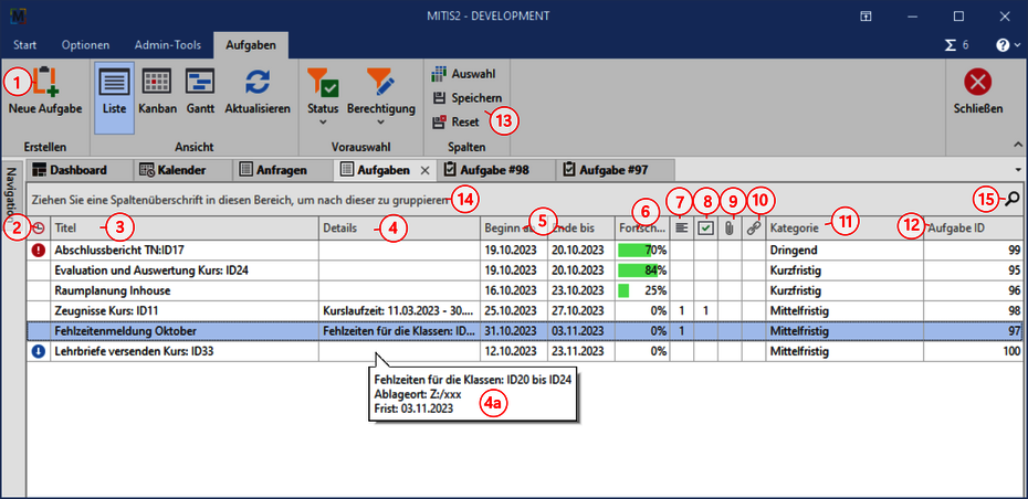 Das Feld Details enthält den näheren Beschreibungstext - siehe auch [7]. Da die Spaltenbreite jedoch bildschirmabhängig begrenzt ist, wird in der Regel nur ein Teil der ersten Zeile angezeigt. Um weitere Inhalte sehen zu können [4a], ohne die Aufgabe extra zu öffnen, führen Sie die Maus auf den Eintrag - ohne zu klicken.